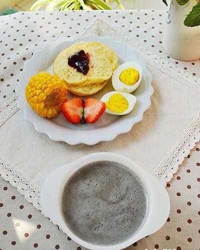 18、果醬面包+玉米+白煮蛋+黑芝麻糊+草莓