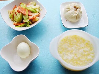 5、豬肉白菜豆腐粉條包+玉米小米粥+胡蘿卜西芹炒馬蹄+白煮蛋