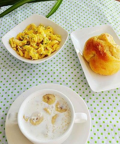 17、奶酪面包卷+蝦皮炒蛋+香蕉牛奶麥片