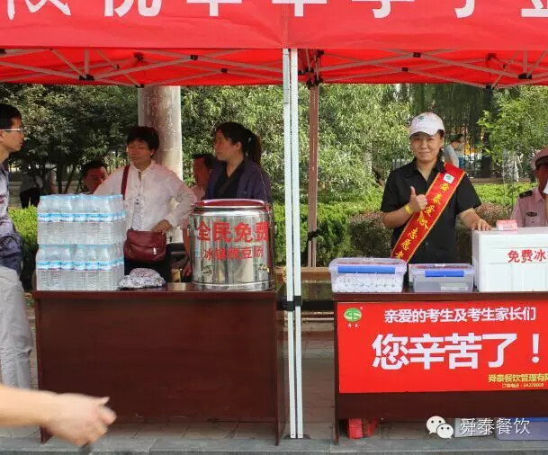 2015年6月7日是高考第一天,在氣溫高達(dá)34攝氏度的炎炎夏日里,濟(jì)南舜泰餐飲管理有限公司旗下舜泰火鍋、舜泰廚房的員工分別在濟(jì)陽一中、濟(jì)陽濟(jì)北中學(xué)兩個(gè)考點(diǎn)門前設(shè)立了“愛心送考休息站”,為應(yīng)考考生及陪同家長(zhǎng)、執(zhí)勤民警、送考司機(jī)們準(zhǔn)備了新鮮的綠豆湯、礦泉水、冰袋、冰毛巾和風(fēng)油精等防暑用品。本次活動(dòng)主要是為了解除高考學(xué)子的后顧之憂,為高考學(xué)子提供愛心支持,使他們能夠在圓大學(xué)夢(mèng)的同時(shí),感受更多的社會(huì)關(guān)愛。